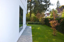 garten für ein sehr reduziertes privathaus in münchen. lange blockstufen terrassieren den garten und schaffen so auf engem raum mehrere gartenräume. die terrasse spielt mit dem ‚ornament‘ des nebengebäudes. die farbe gelb, als gestaltungselement im gebäude benutzt, zieht sich auch in den garten. gelbblühende stauden und herbstfärbende gräser bespielen die räume. solitäre gehölze werden spannungsvoll zum innenraum platziert und ziehen den blick nach außen.
